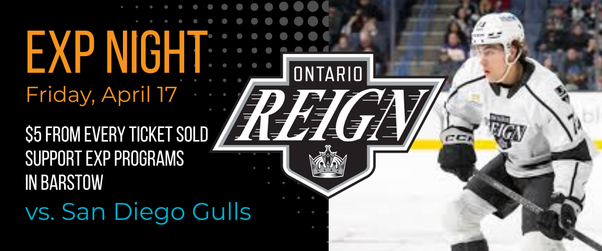Join the EXP team and our students from Barstow High School and Central High School for an evening of fun as the Ontario Reign takes on the San Diego Gulls on Friday, April 17, at 7 p.m., at Toyota Arena in Ontario. $5 from every ticket sold will go to support EXP programs in Barstow!